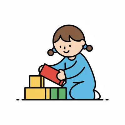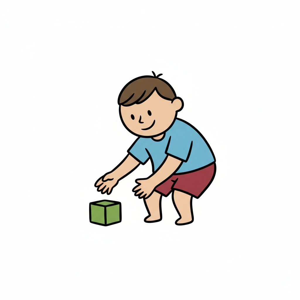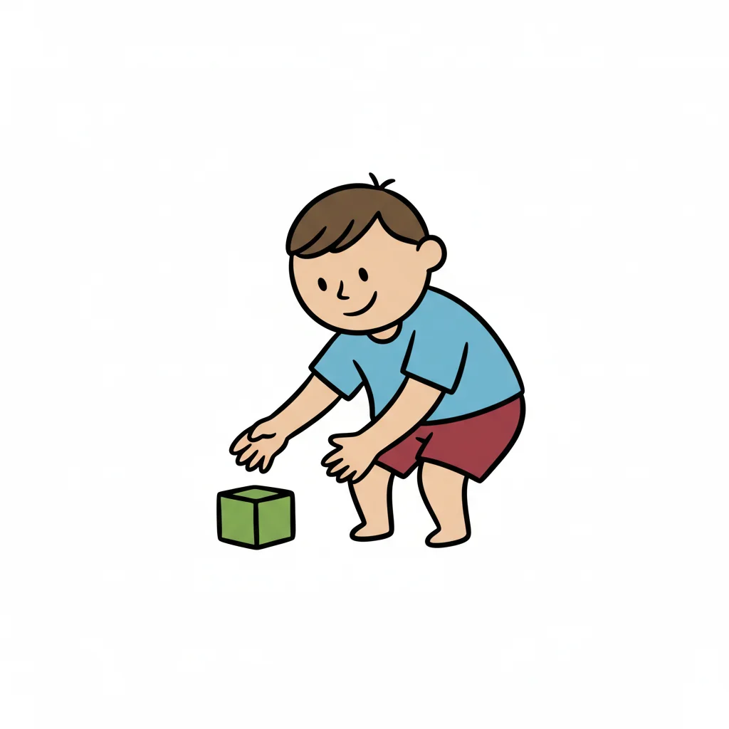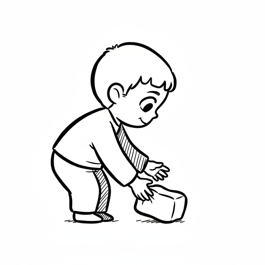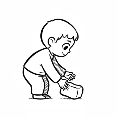 Strichzeichnung eines lächelnden Jungen, der einen Baustein aufhebt.