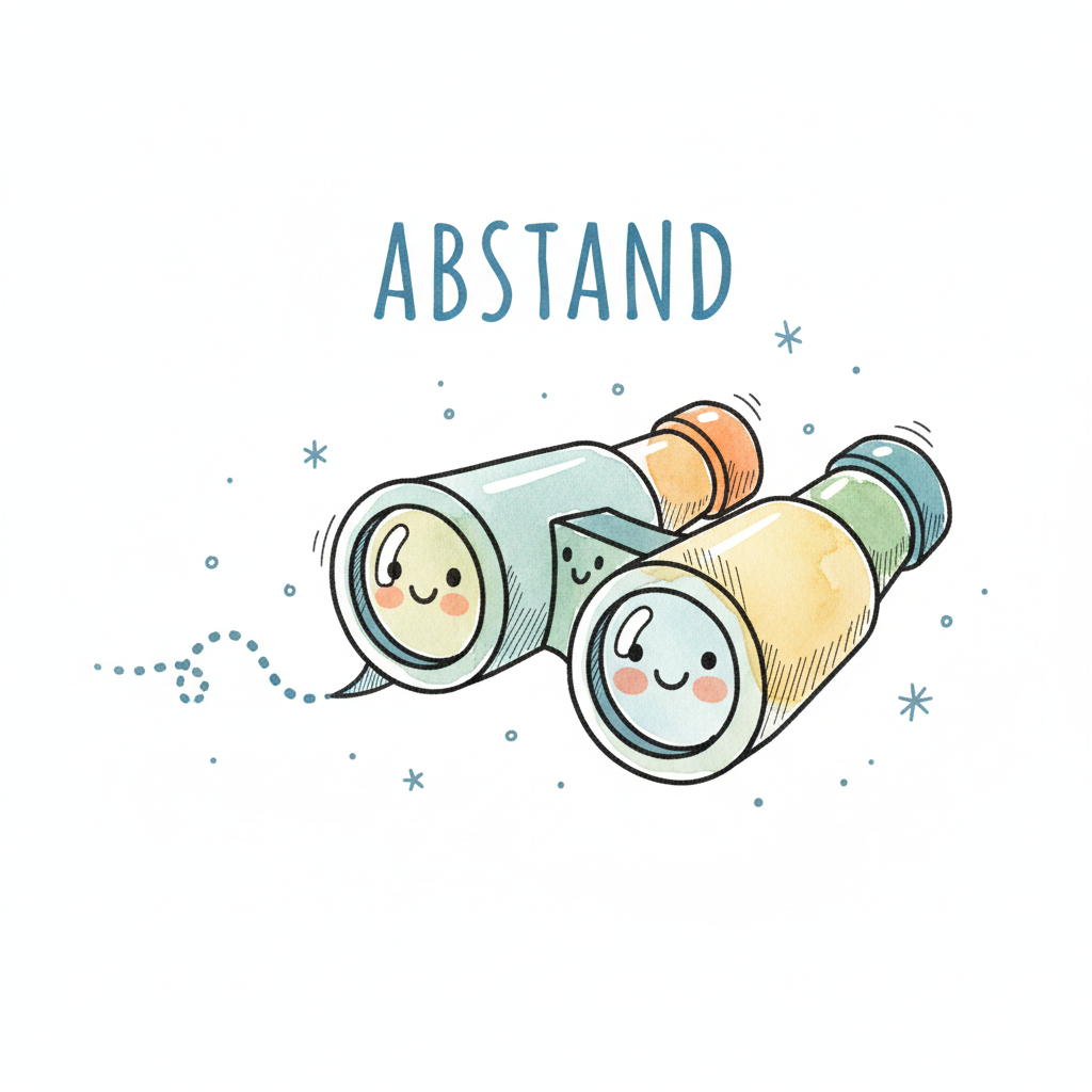 Zwei lächelnde Ferngläser mit dem Wort 'ABSTAND' darüber, eine süße Darstellung von Distanz.