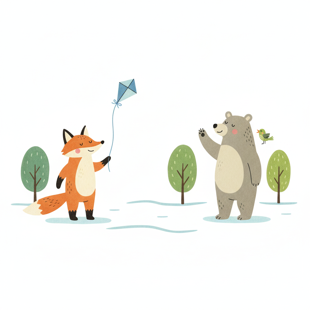 Niedlicher Fuchs mit Drachen und winkender Bär mit Vogel in einer freundlichen Waldillustration.