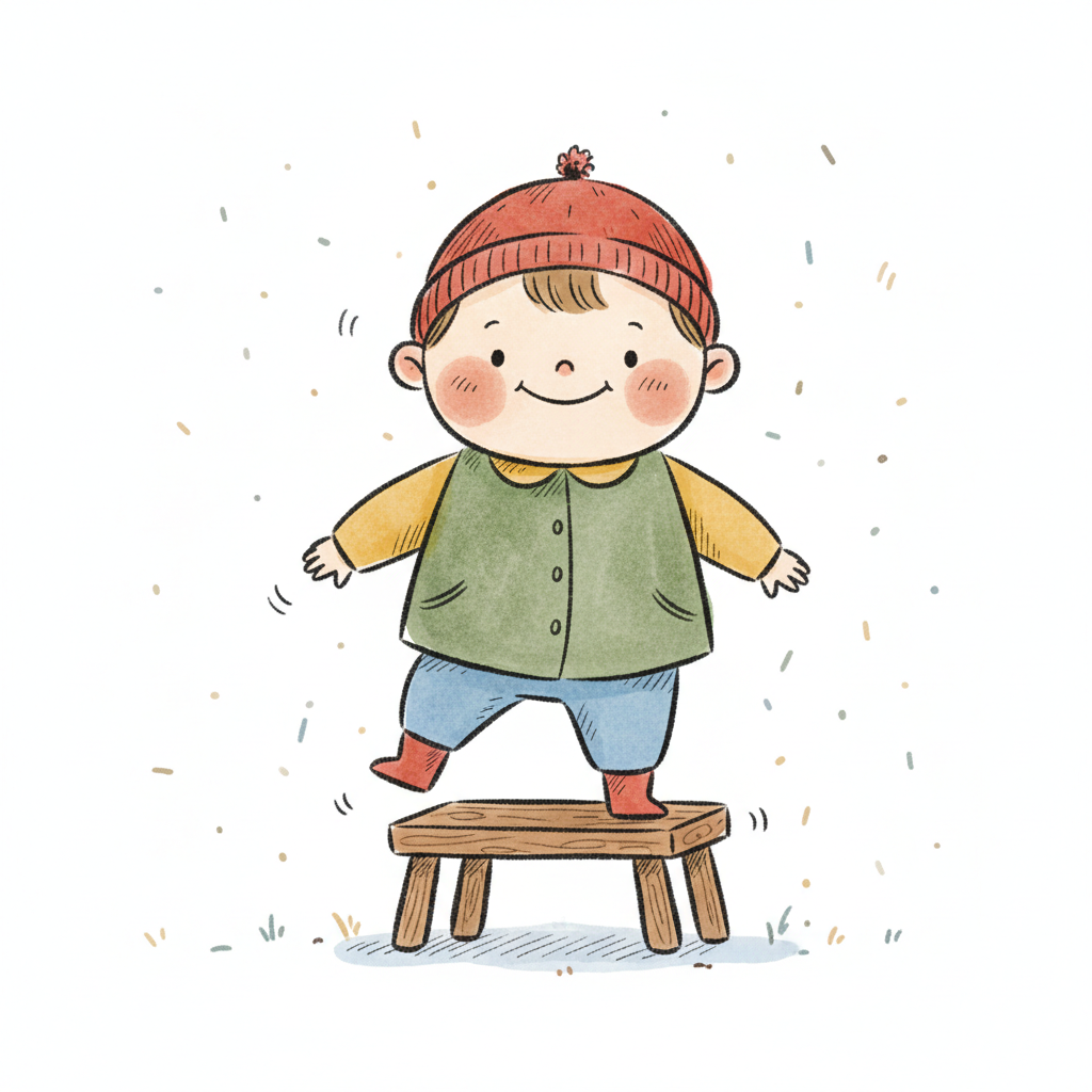 Niedliches Cartoon-Kind mit Mütze steht lächelnd auf einem Hocker und balanciert.