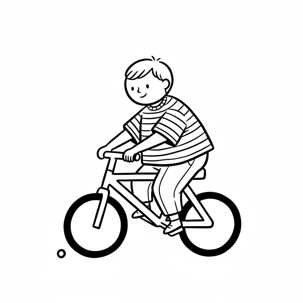 Schwarz-weiße Strichzeichnung eines lächelnden Jungen in gestreiftem Shirt auf einem Fahrrad.