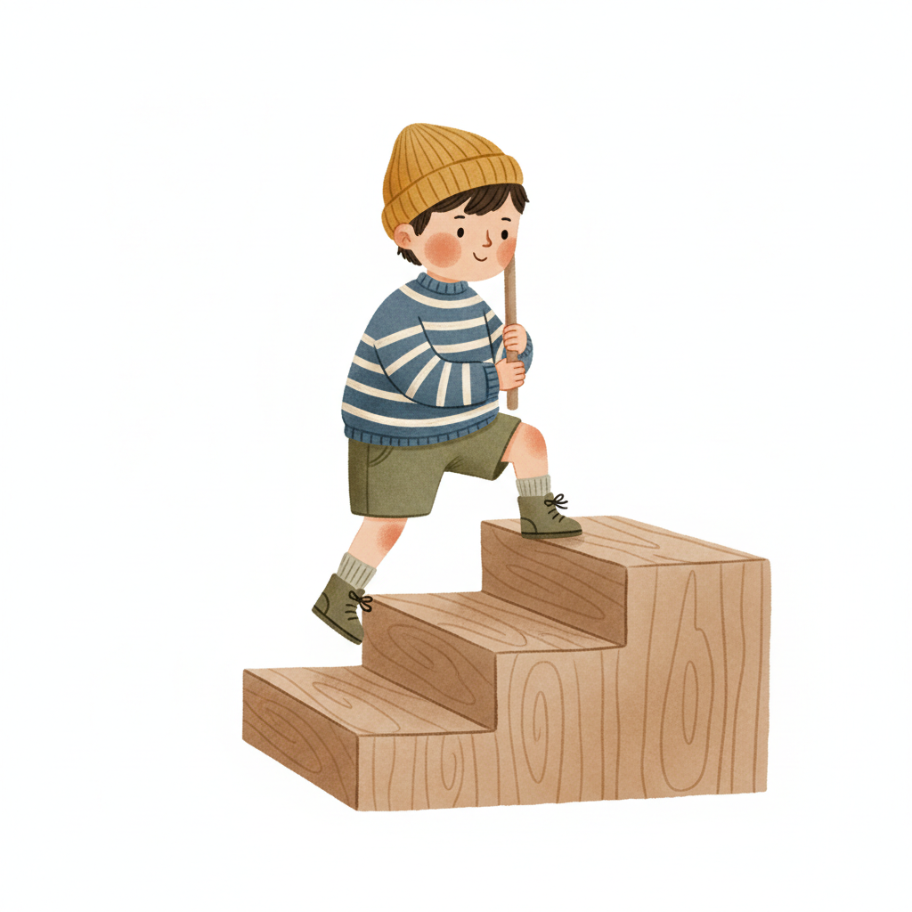 Niedlicher Cartoon-Junge mit Mütze und Stock steigt Holztreppe hinauf.