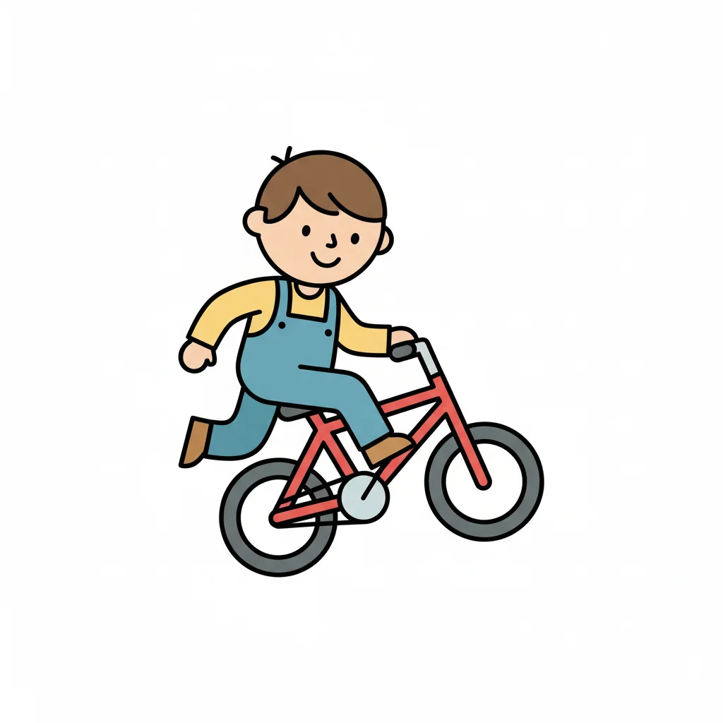 Fröhlicher Cartoon-Junge in Latzhose fährt auf einem roten Fahrrad.