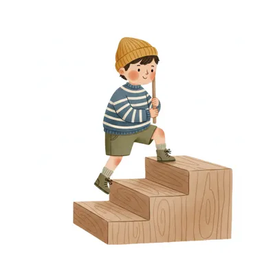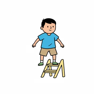 Ein Cartoon-Junge steht auf einer kleinen Trittleiter. Er trägt ein blaues T-Shirt und braune Shorts.