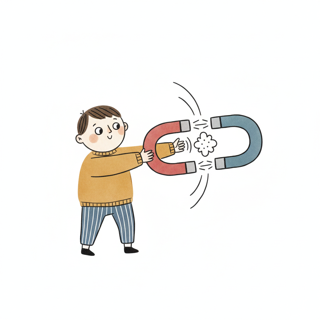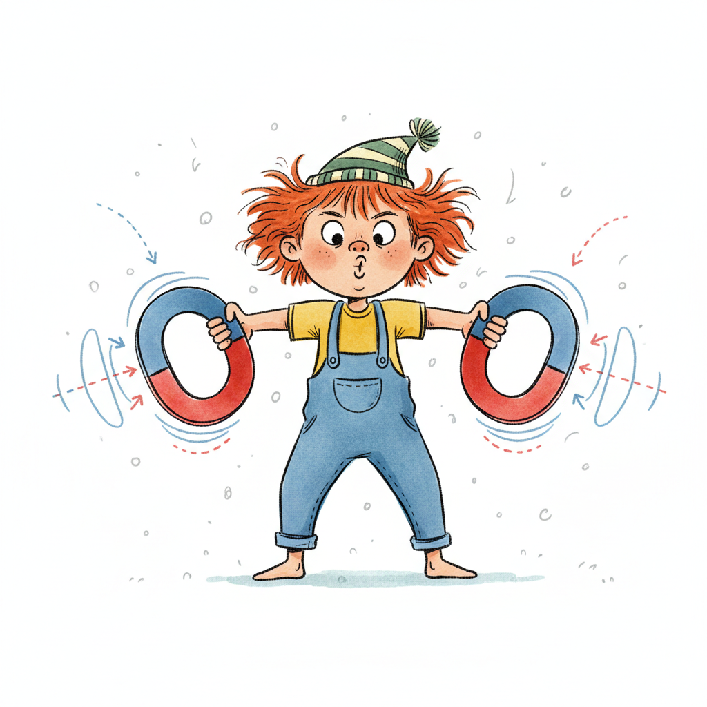 Ein fröhlicher Junge spielt mit zwei Hufeisenmagneten, die sich mit bunten Kräften anziehen.