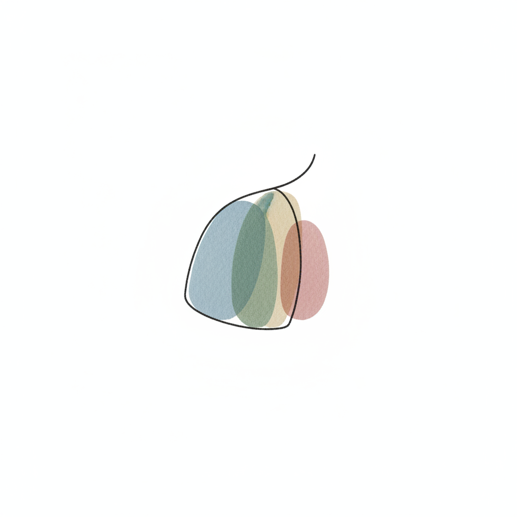 Abstrakte Form mit überlappenden, farbigen Bereichen und feiner Umrandung.