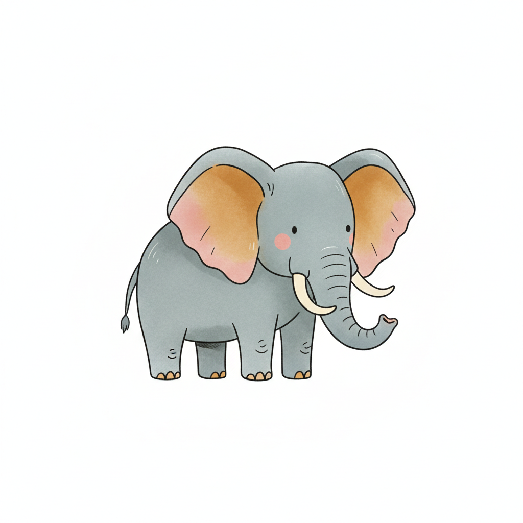 Ein niedlicher, gezeichneter Elefant mit großen Ohren und freundlichem Gesicht.