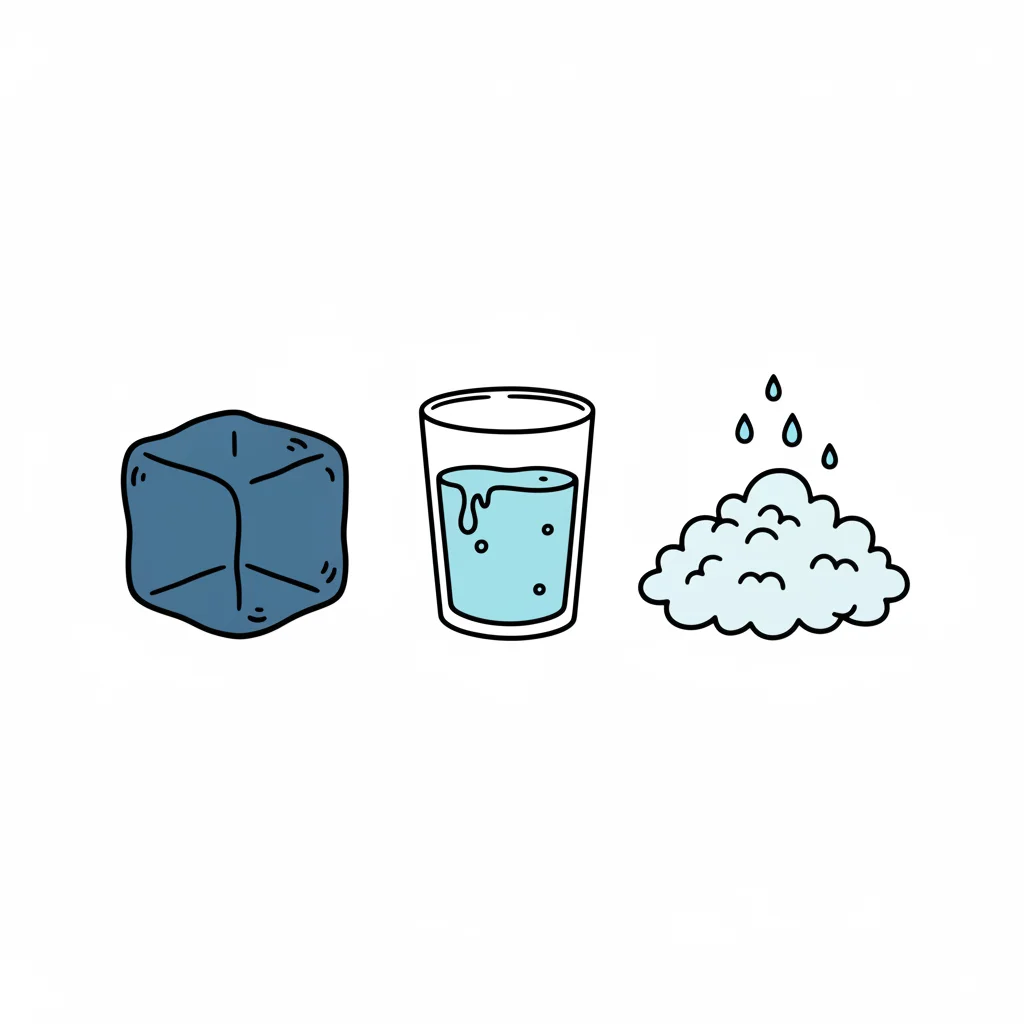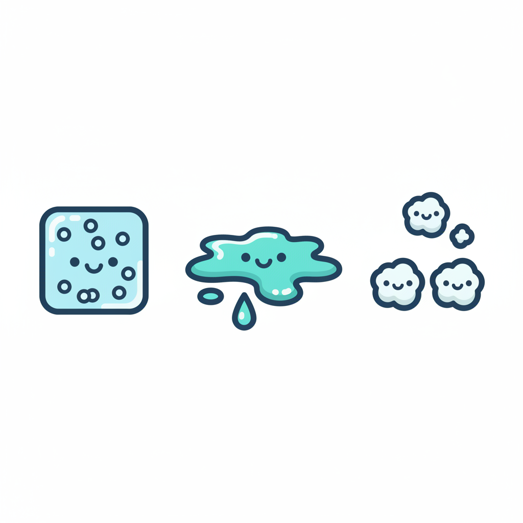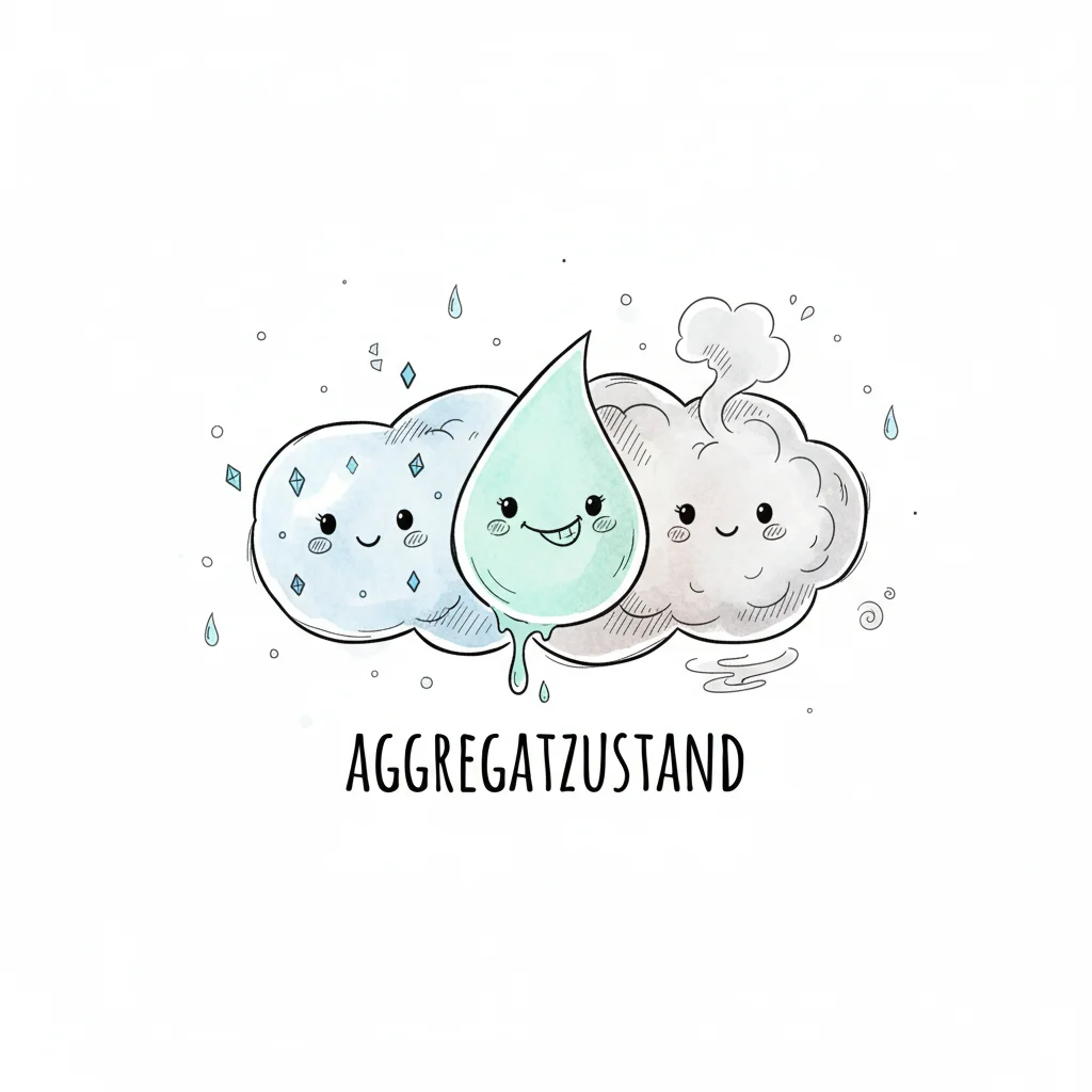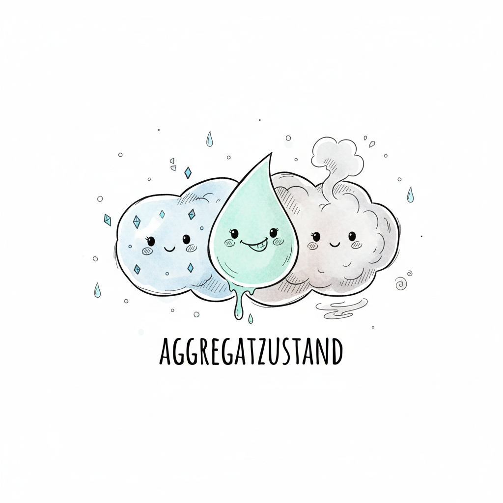 Niedliche Darstellung der drei Aggregatzustände von Wasser: fest, flüssig, gasförmig.