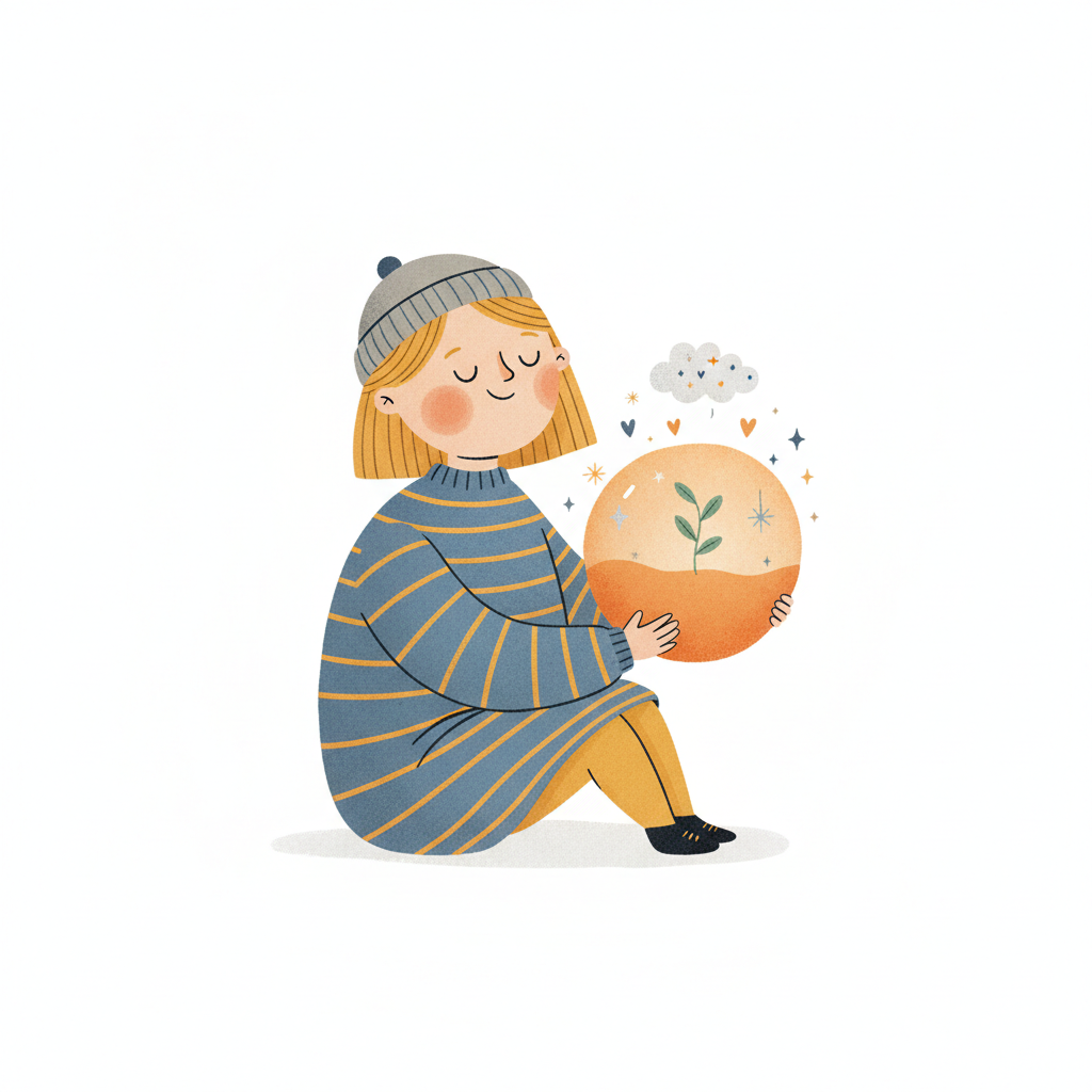 Mädchen hält liebevoll eine leuchtende Kugel mit Pflanze, umgeben von Herzen und Sternen.