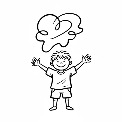 Ein lächelnder Cartoon-Junge mit ausgestreckten Armen und einer Gedankenblase über dem Kopf.