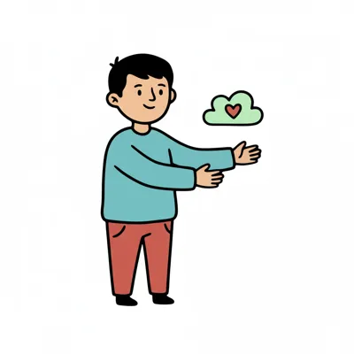 Lächelnder Cartoon-Junge präsentiert eine grüne Wolke mit rotem Herz.