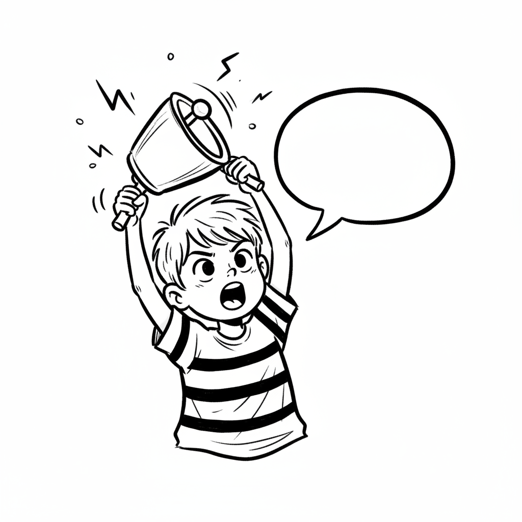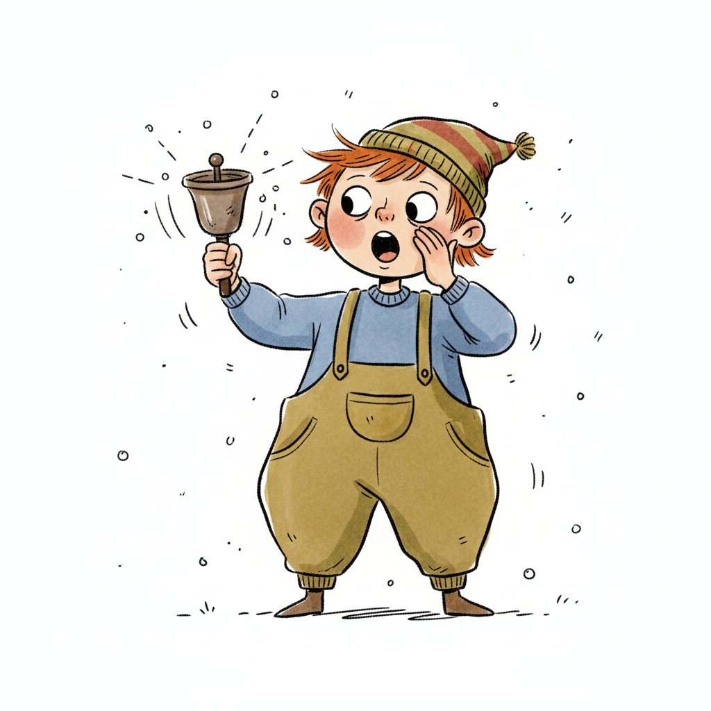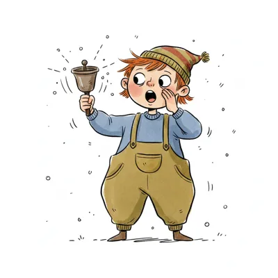 Ein Junge läutet laut eine Glocke mit offenem Mund und einer Sprechblase daneben.