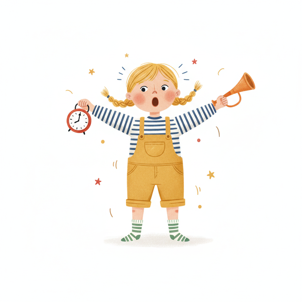 Blondes Mädchen mit Zöpfen hält Wecker und Horn, schreit überrascht.