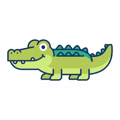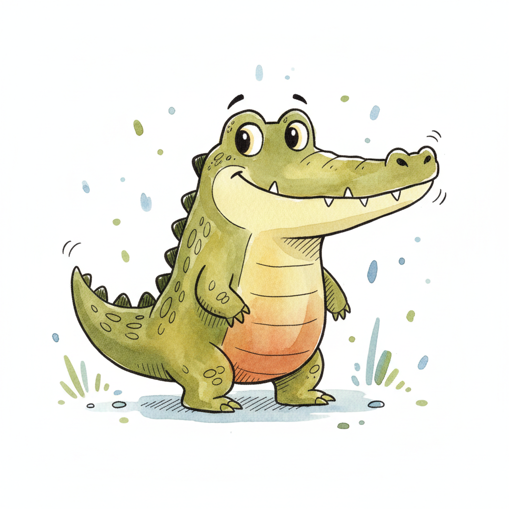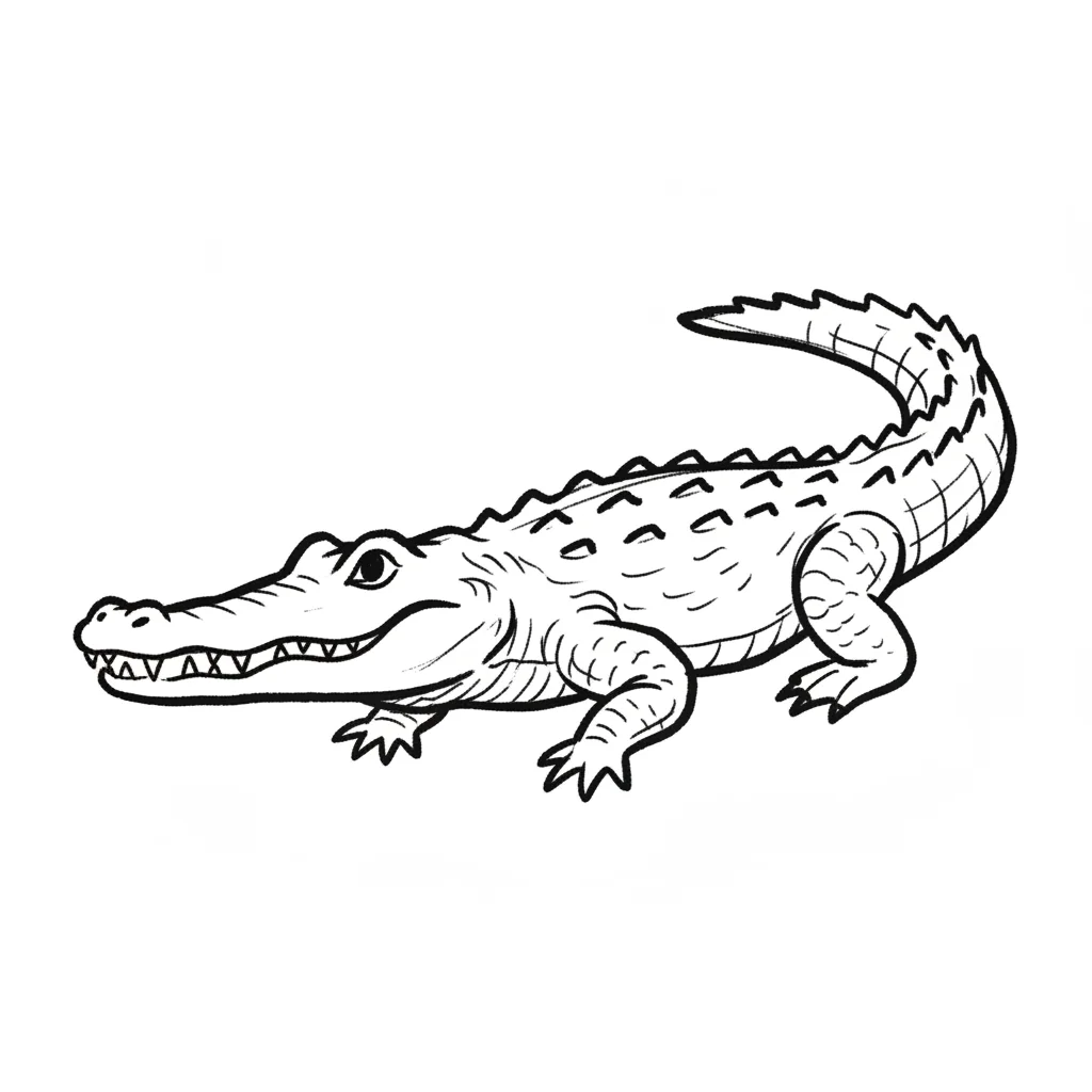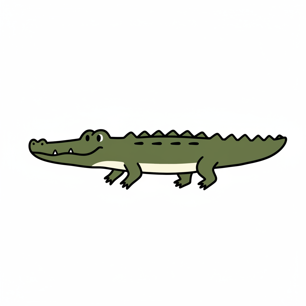 Ein gezeichneter Krokodil mit deutlichen Details und einem freundlichen Gesicht.