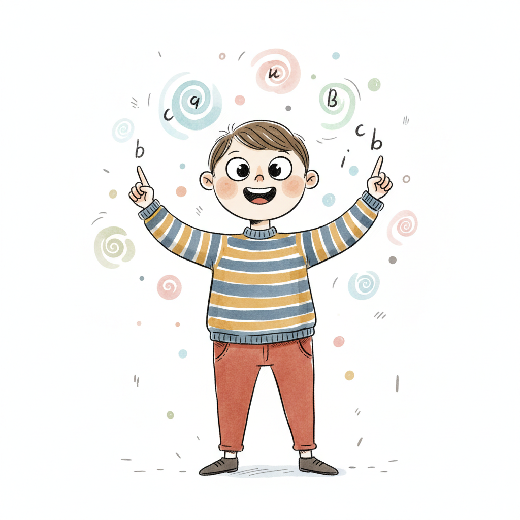 Fröhlicher Cartoon-Junge zeigt auf schwebende Buchstaben und bunte Wirbel.