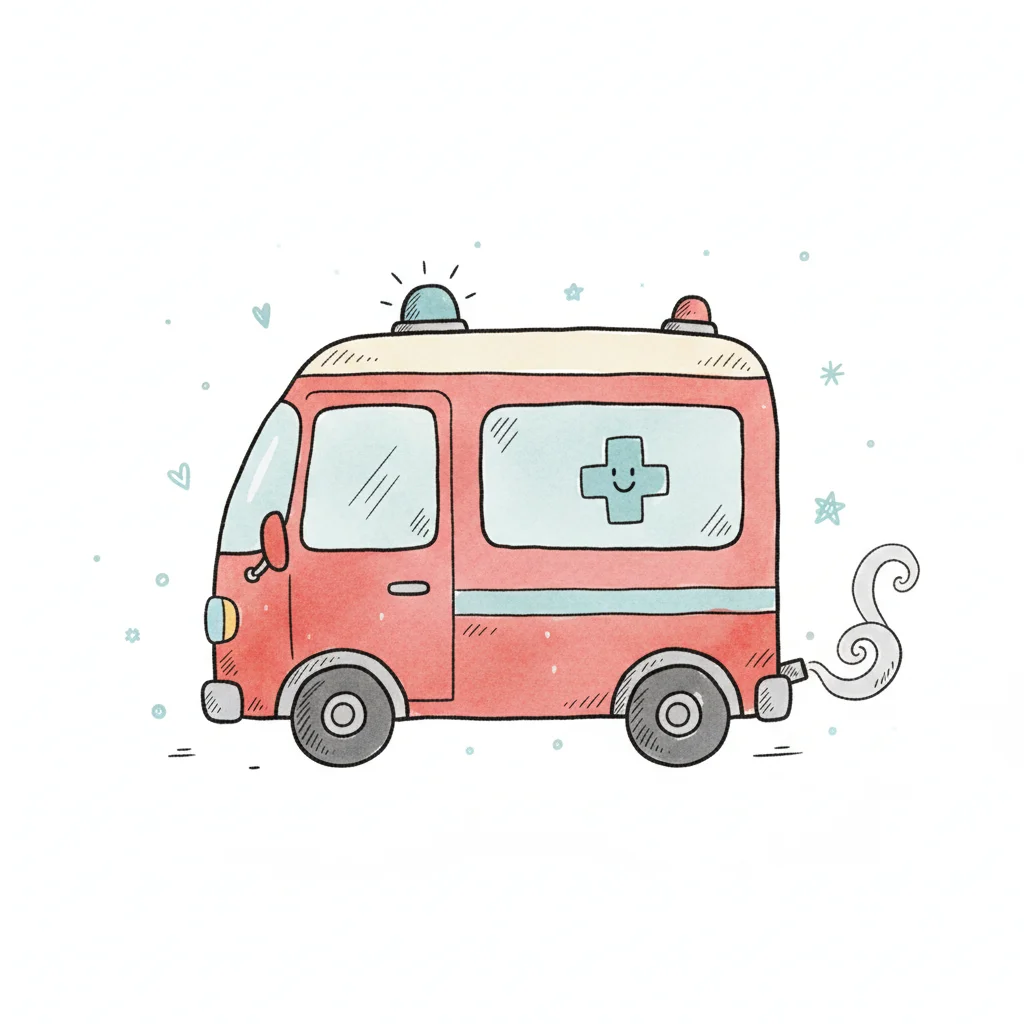 Aquarell-Cartoon-Ambulanz in Hellblau mit lächelndem roten Kreuz und Blaulicht.
