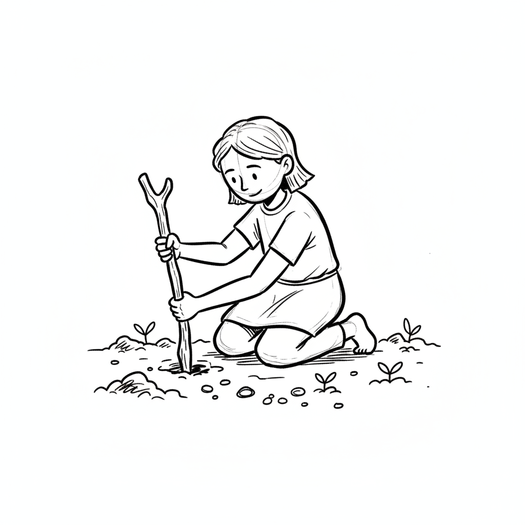 Schwarz-Weiß-Zeichnung eines Mädchens, das mit einem Stock im Boden kniet und kleine Pflanzen setzt.