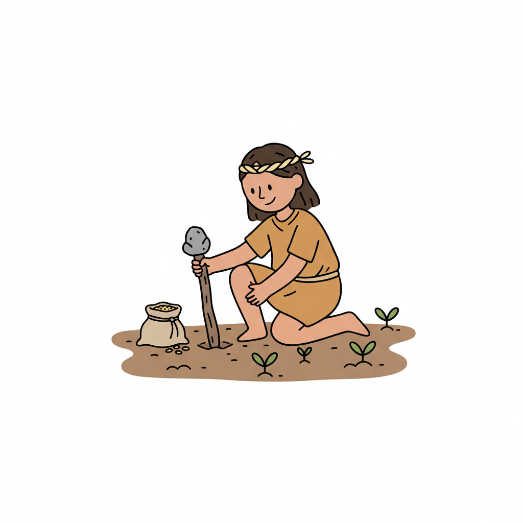 Eine Person pflanzt Samen mit einem einfachen Werkzeug; kleine Pflanzen sprießen aus der Erde.