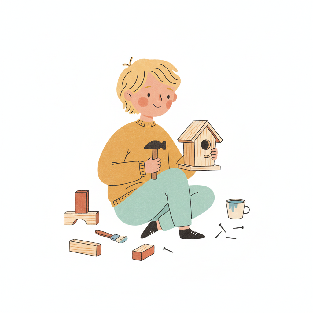 Ein lächelndes Kind baut ein Vogelhaus mit Hammer und Nägeln, umgeben von Holzklötzen und Werkzeug.