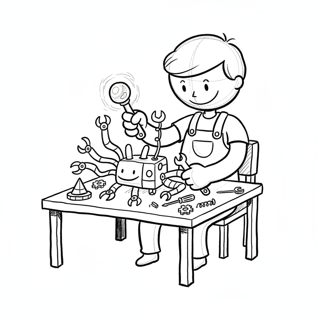 Ein Junge bastelt an einem lächelnden Roboter mit vielen Werkzeugen auf einem Tisch.