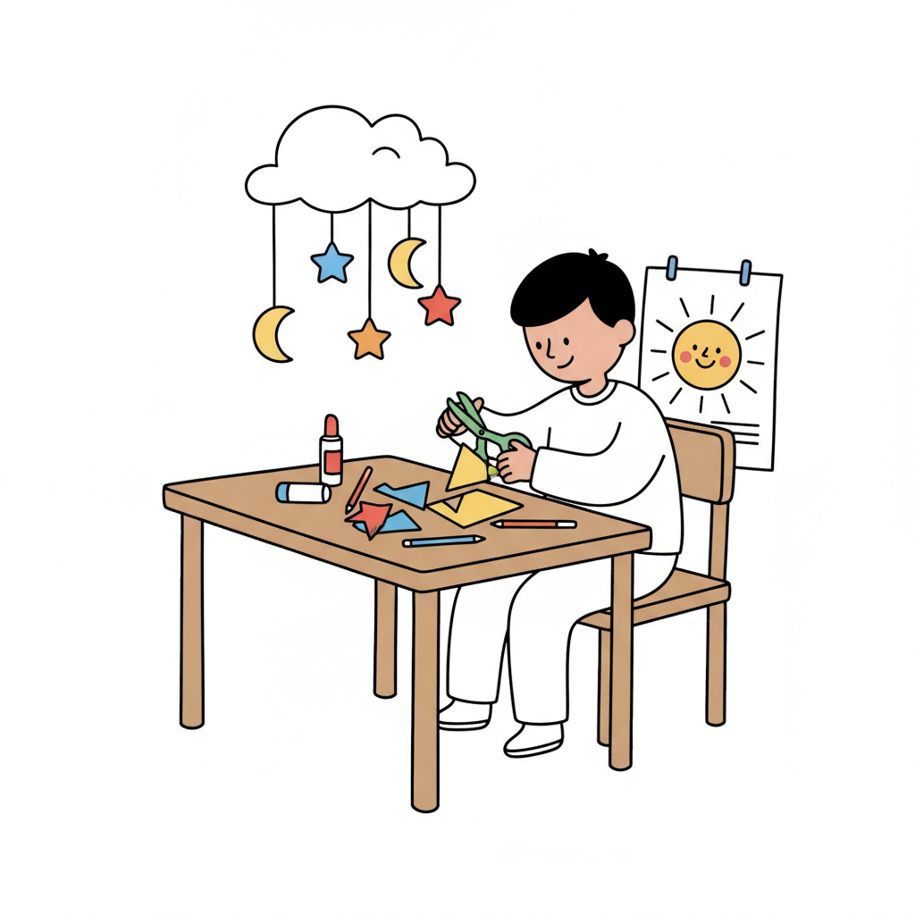 Ein Kind sitzt an einem Tisch und bastelt mit Schere und Papier, umgeben von Bastelmaterial.