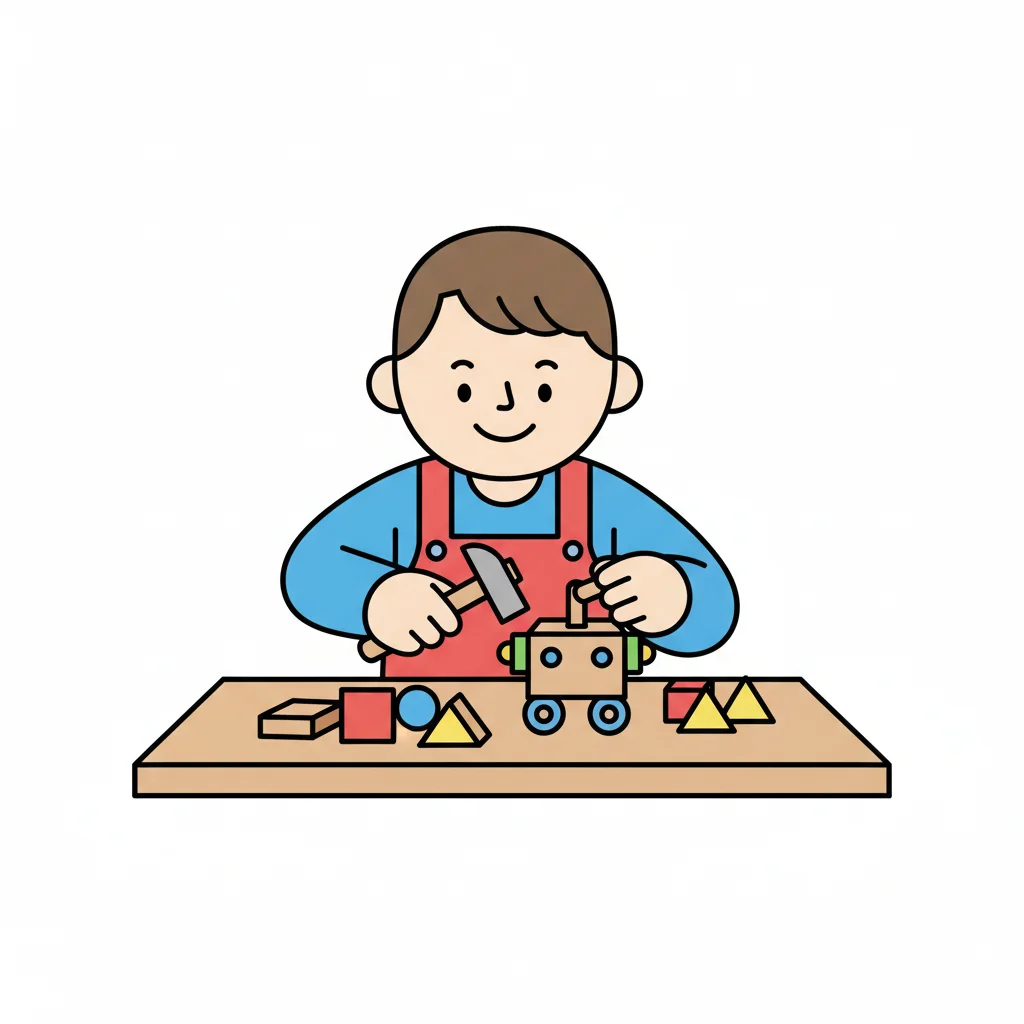 Ein lächelnder Junge bastelt mit Holzklötzen und einem Hammer an einem Spielzeugauto.