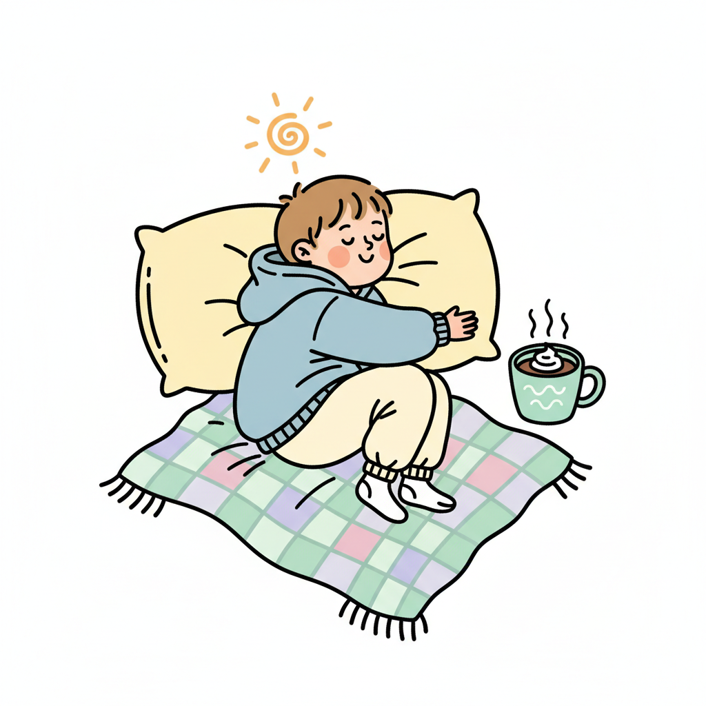 Ein Kind schläft gemütlich auf einer Decke mit Kissen und einer Tasse Kakao.