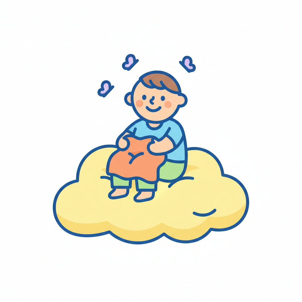 Ein lächelnder Junge sitzt auf einer Wolke, hält eine Decke, umgeben von Schmetterlingen.