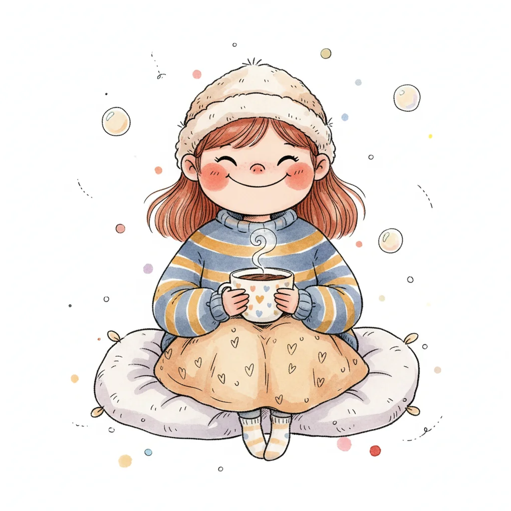 Niedliche, kindgerecht illustrierte Szene mit einem Kind oder einer Person als Hauptfigur, vor rein weißem Hintergrund, im frech-nordischen Aquarell-Skizzenstil. Klare, leicht wackelige Tuschekonturen, sichtbare Pinsel- und Strichtextur, dezente Schraffuren, weiche handgemalte Farbflächen in gedeckten Farben. Einfache, runde Formen. Keine harten Schatten, sondern sanfte, transparente Aquarellschichten. Leicht raue, handgezeichnete Linien statt glatter Vektorkanten. Subtile, vereinzelte Kritzelpunkte oder kleine Details im Hintergrund (wie Pünktchen oder feine Striche), aber keine echte Umgebung oder Landschaft. Die Figur ist mittig zentriert. Insgesamt charmant, humorvoll, warm und handgemacht wirkend. WICHTIG: Das Bild darf ABSOLUT KEINEN TEXT, KEINE BUCHSTABEN und KEINE ZAHLEN enthalten.