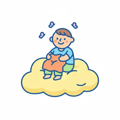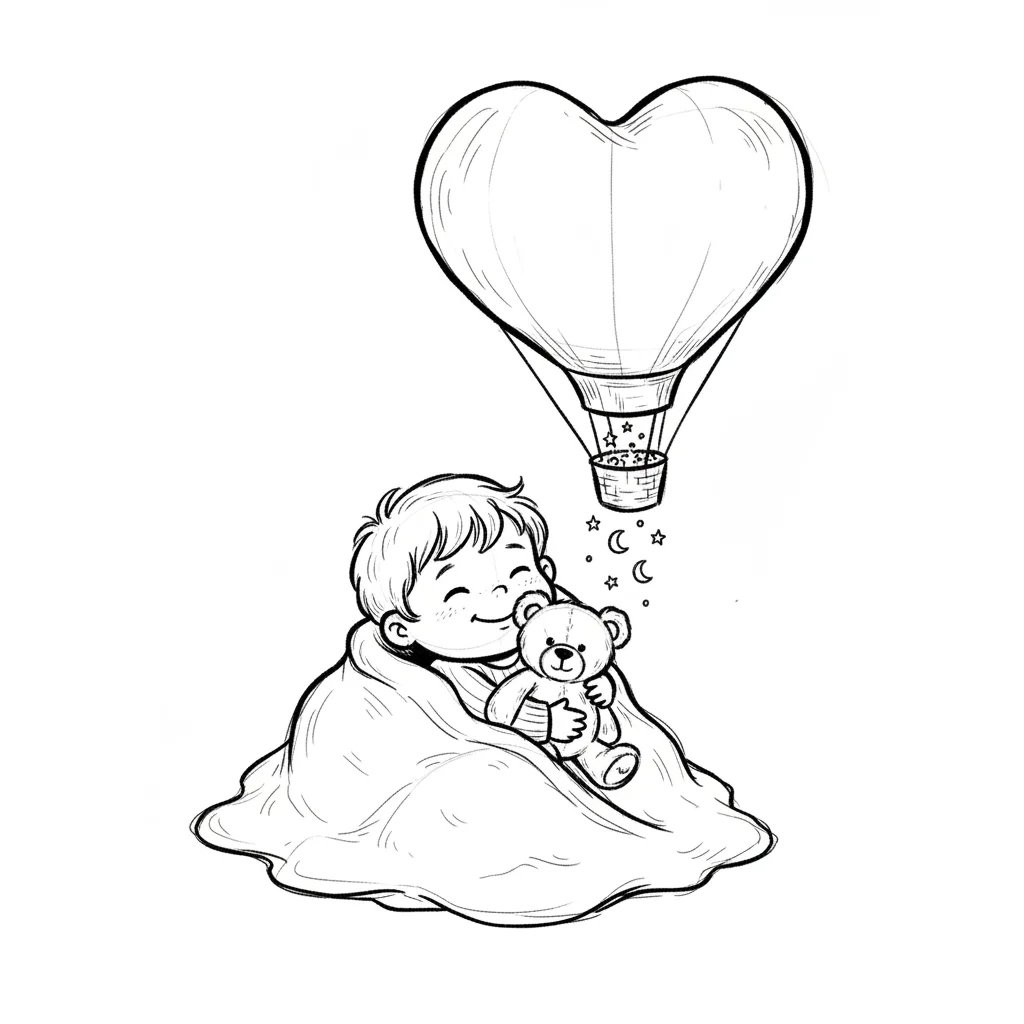 Ein Baby schläft friedlich auf einer lächelnden Wolke, umgeben von Sternen und Herzen.