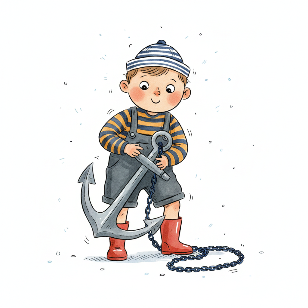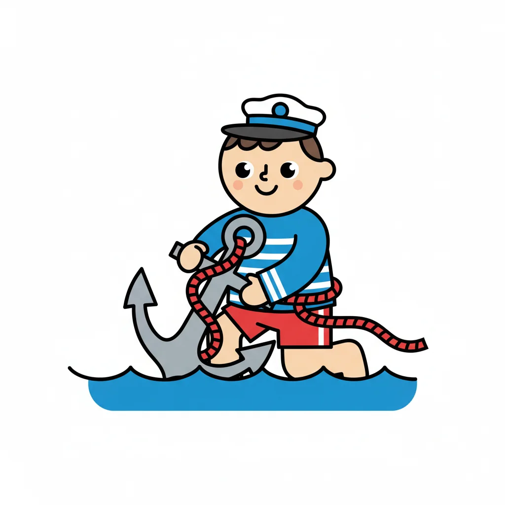 Niedlicher Cartoon-Seemannsjunge mit Anker im Wasser, umwickelt von einem roten Seil.