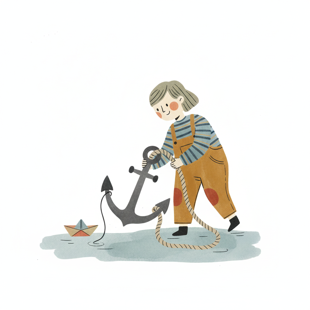 Ein Kind zieht einen Anker, daneben schwimmt ein Papierboot im Wasser. Niedliche Illustration.