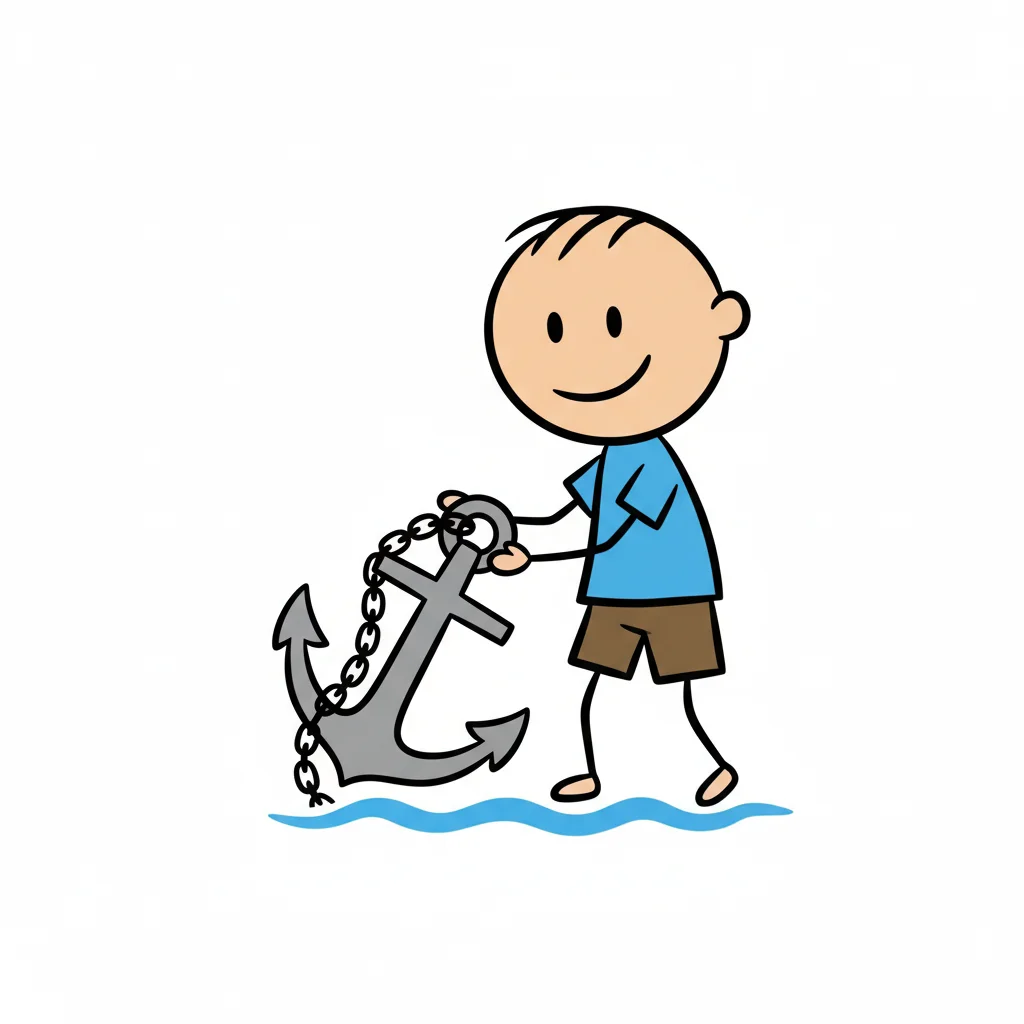 Lächelndes Strichmännchen-Kind hält einen Anker mit Kette, der im Wasser liegt.