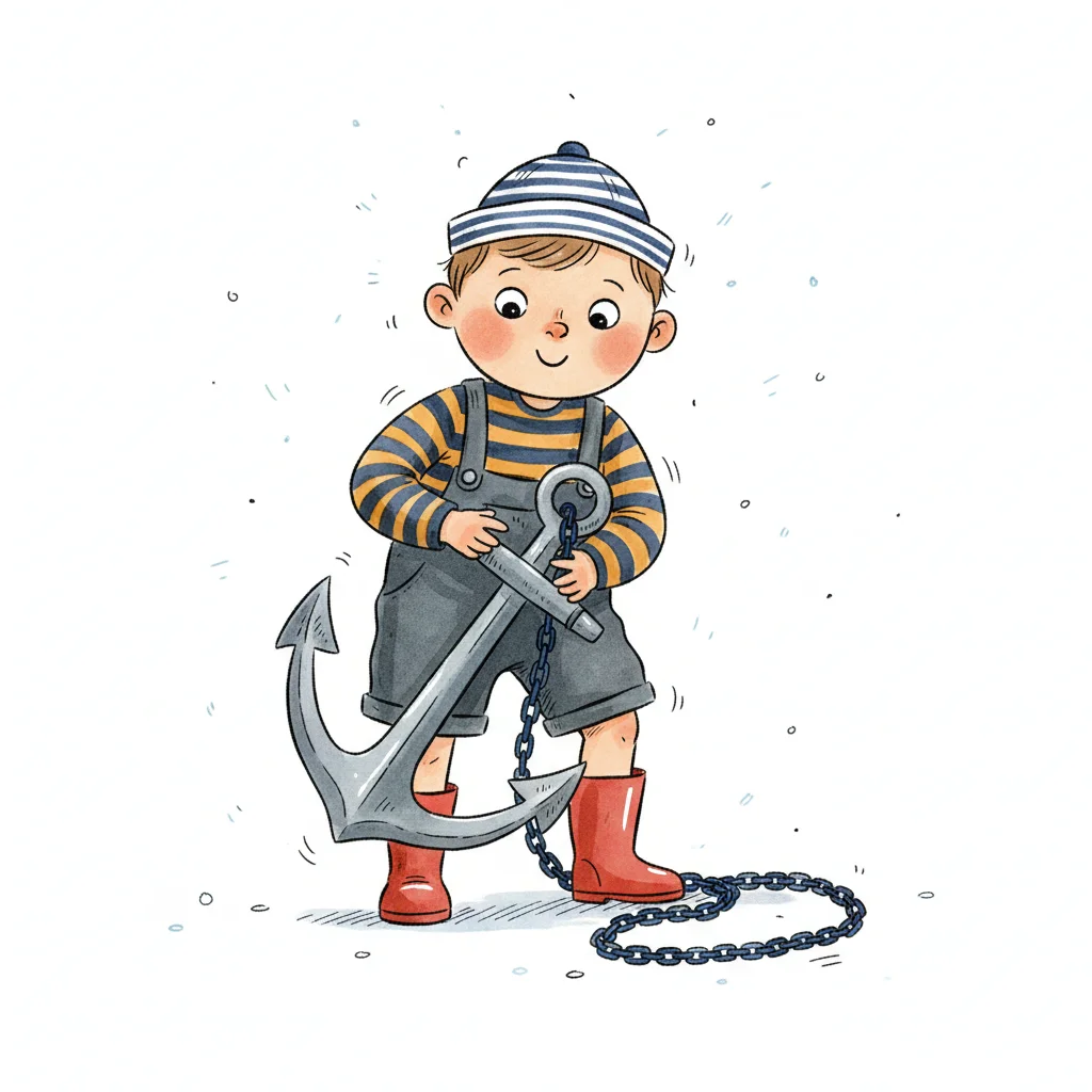 Fröhlicher Cartoon-Junge als Matrose mit Anker und Kette.