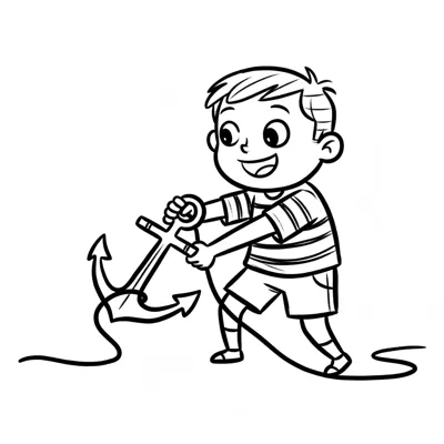 Schwarz-weiß-Cartoon eines lächelnden Jungen, der einen Anker mit Seil hält.