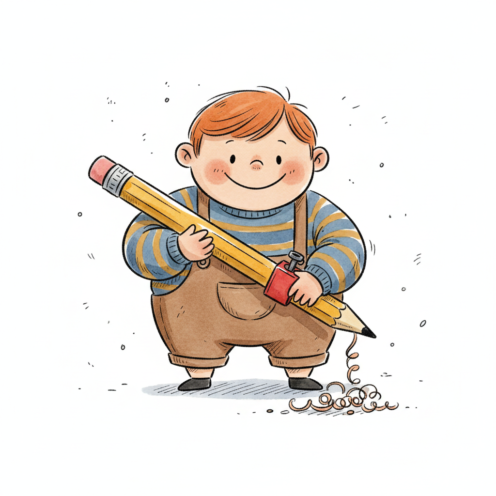 Handgezeichnete Kinderbuchillustration im modernen skandinavisch-nordischen Stil. Minimalistische, freundliche Figur mit einfachen Formen und leicht unregelmäßigen, handgezeichneten Linien. Ruhige, gedeckte Farbpalette, viel freie Fläche, reduzierte Details, sanfte Papier- oder Aquarellstruktur. Warme, ruhige, leicht humorvolle Stimmung, flächige Komposition ohne starke Perspektive, moderner nordischer Illustrationsstil, charmant und zeitlos.