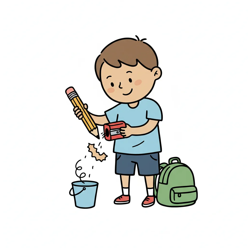 Ein Junge schärft einen Bleistift über einen Eimer.