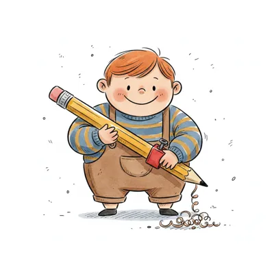 Ein fröhlicher Junge hält einen großen Bleistift in der Hand.
