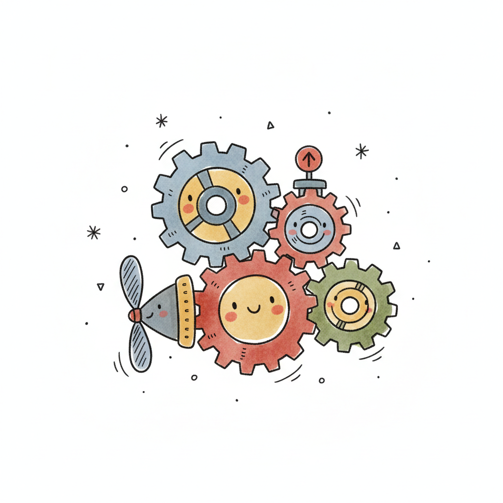 Niedliche, lächelnde Zahnräder in verschiedenen Farben, teils mit Propeller, als Cartoon-Illustration.