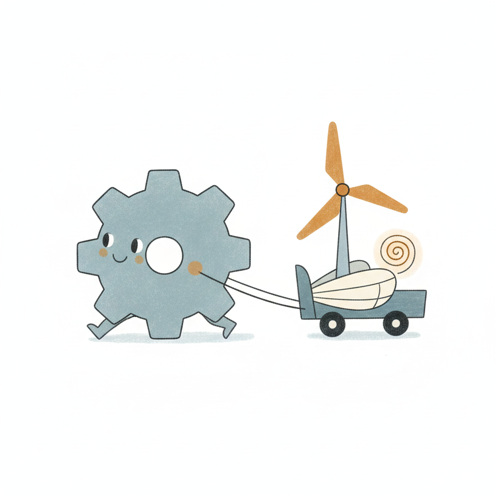 Ein süßes Zahnrad zieht ein kleines Auto mit Windrad und Muschel.