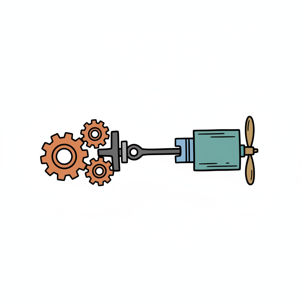 Handgezeichnete Illustration eines mechanischen Systems mit Zahnrädern, Kolben und Propeller.