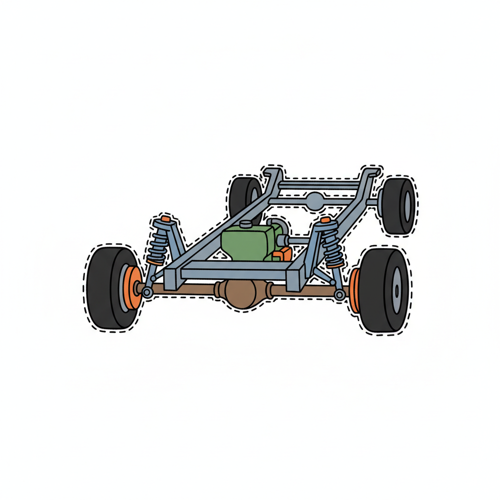 Illustration eines Fahrzeugchassis mit Rädern, Aufhängung und Antriebsstrang.