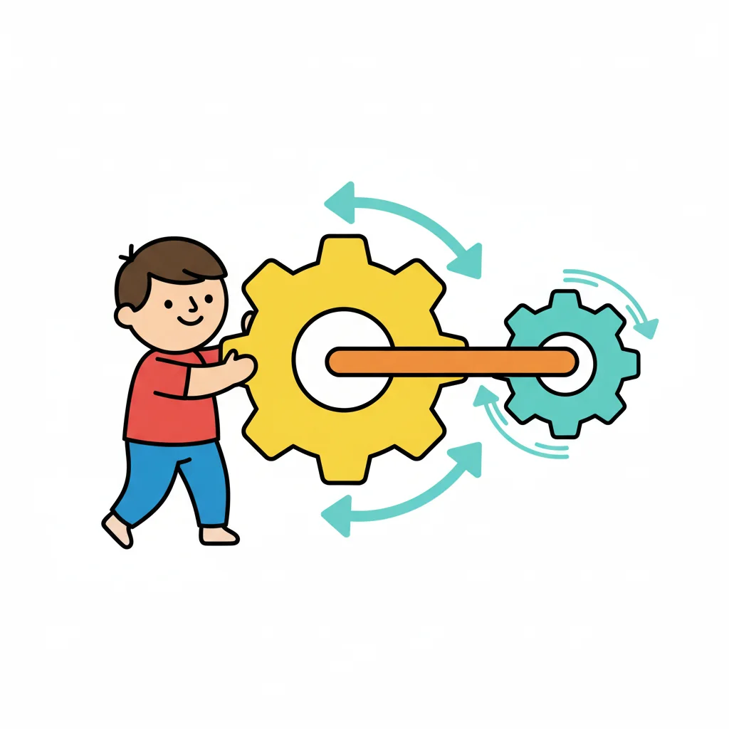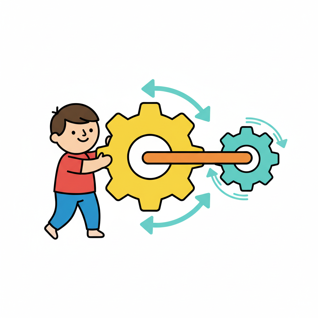 Junge dreht ein großes Zahnrad, das ein kleineres Zahnrad antreibt und Bewegung erzeugt.