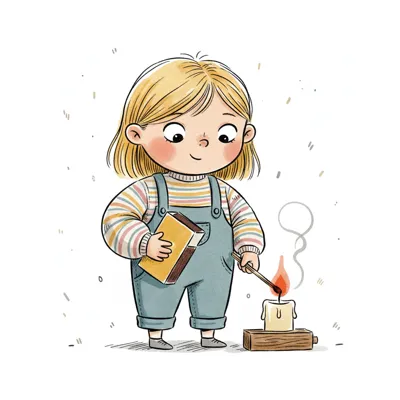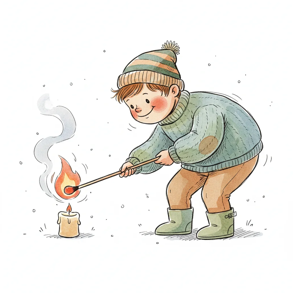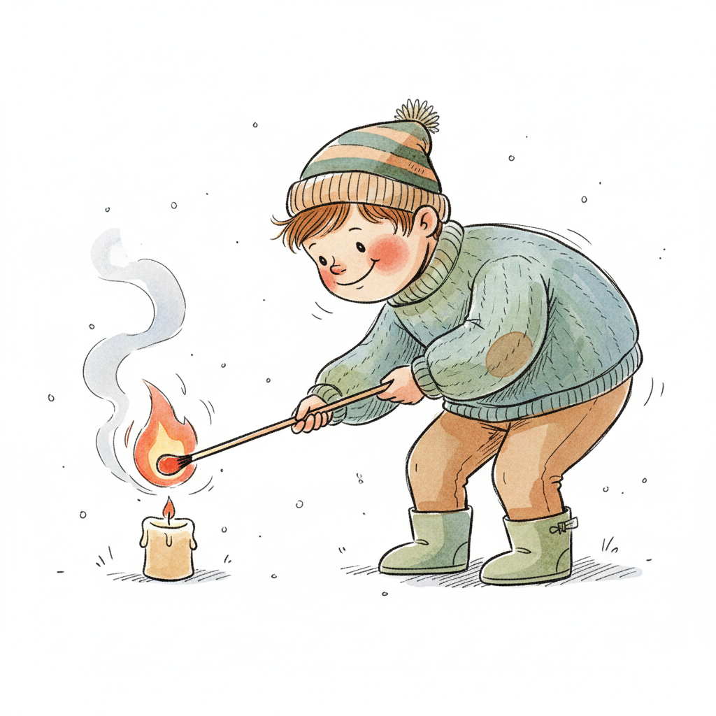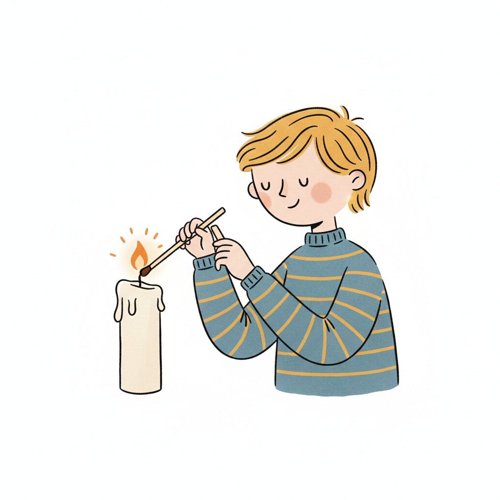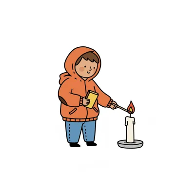 Ein Cartoon-Kind in orangefarbener Jacke zündet eine weiße Kerze mit einem Streichholz an.