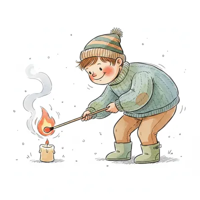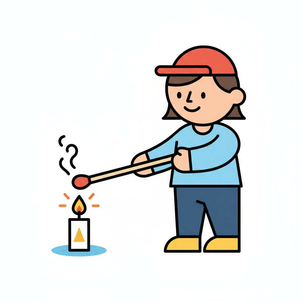 Eine lächelnde Cartoonfigur mit roter Kappe zündet eine Kerze mit einem Streichholz an.
