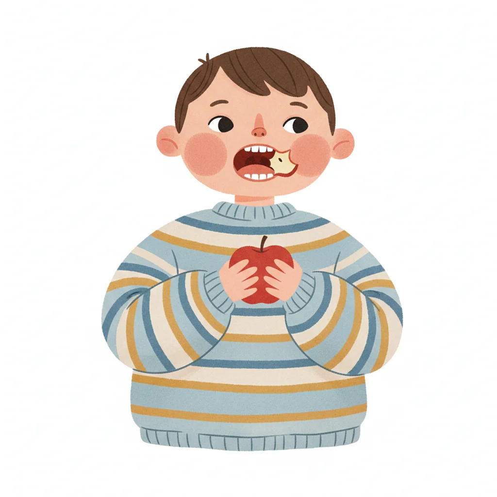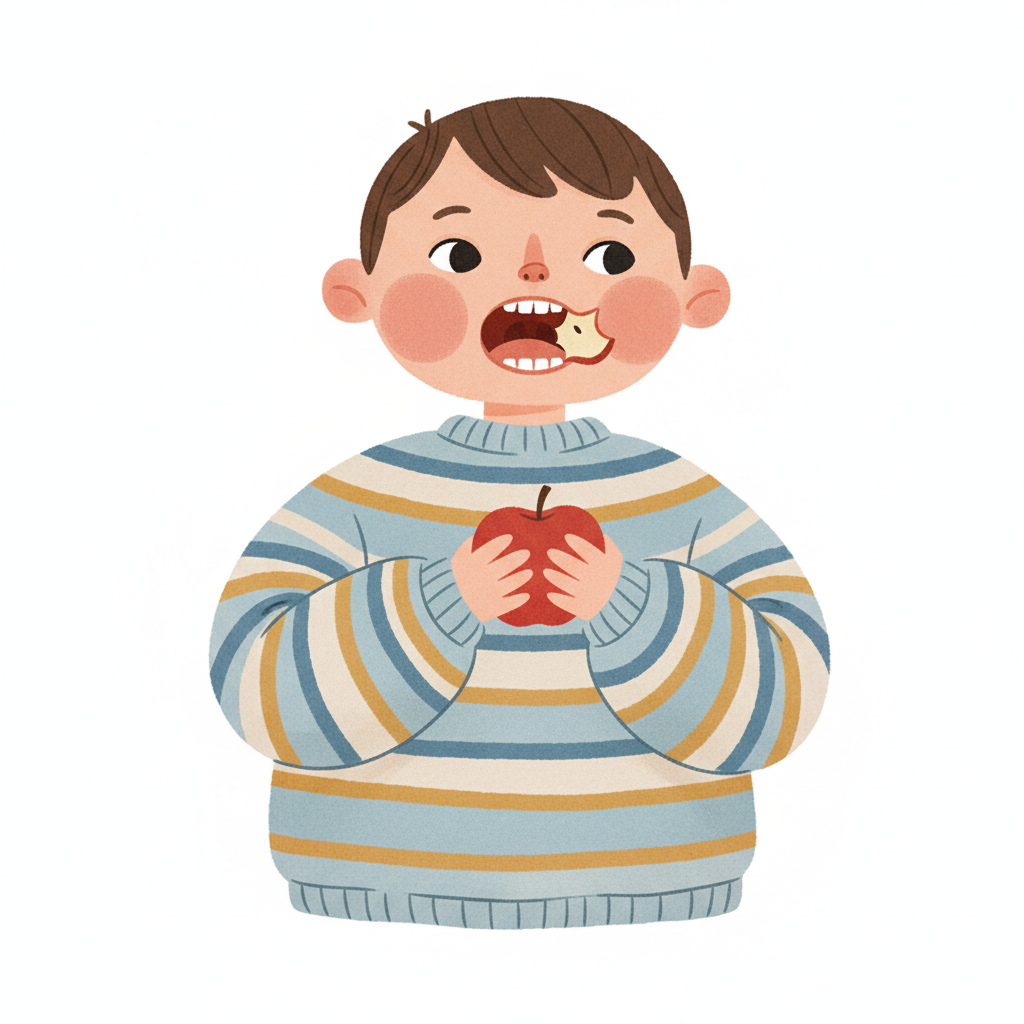 Ein Junge mit gestreiftem Pullover isst einen Apfel.