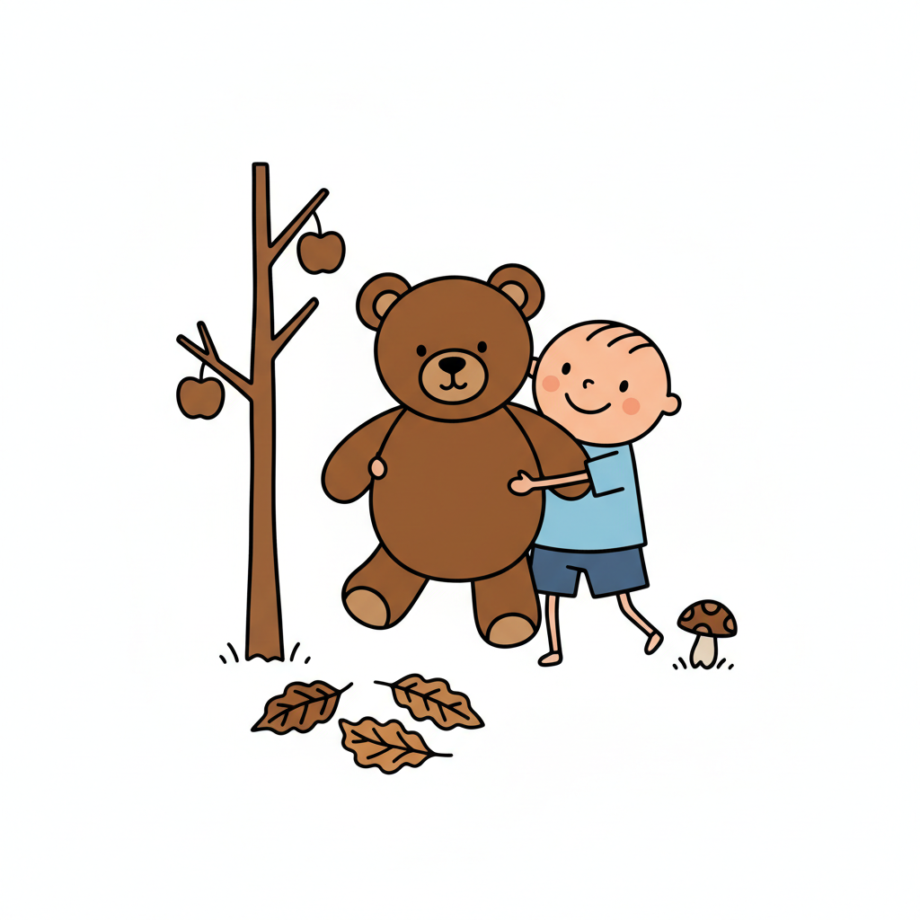 Ein lächelnder Junge umarmt einen Teddybär neben einem Apfelbaum mit Blättern und Pilz.