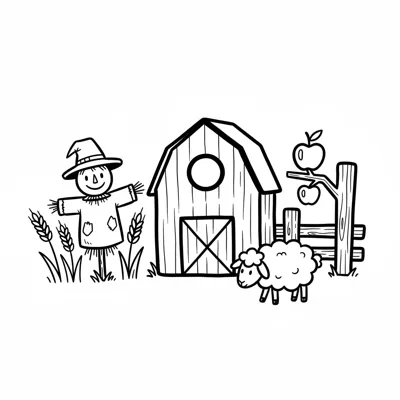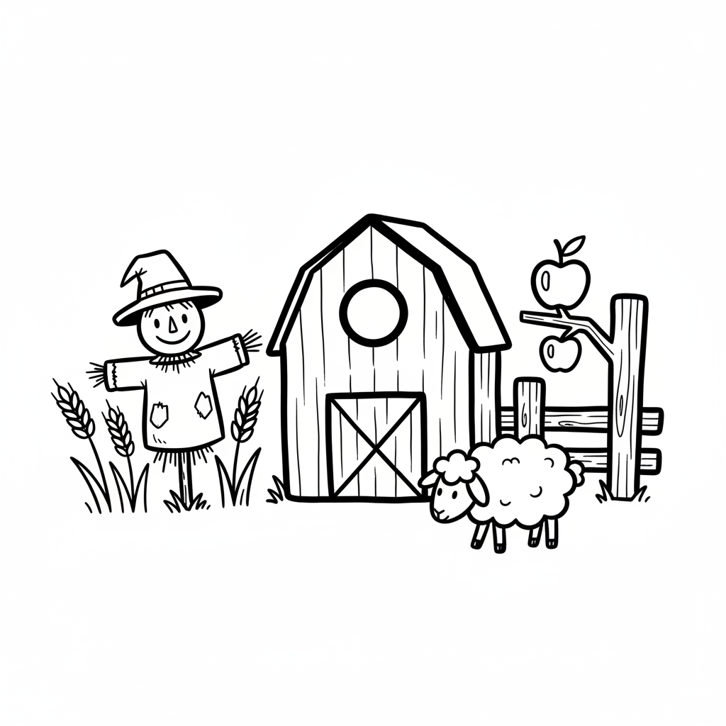 Schwarz-weiß-Zeichnung einer Bauernhofszene mit Vogelscheuche, Scheune, Schaf und Apfelbaum.