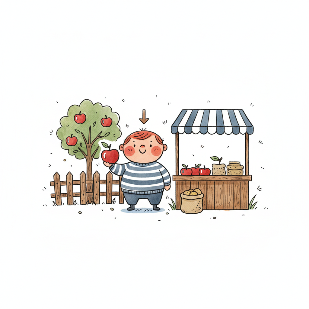 Fröhlicher Junge mit Apfel vor Marktstand und Apfelbaum.