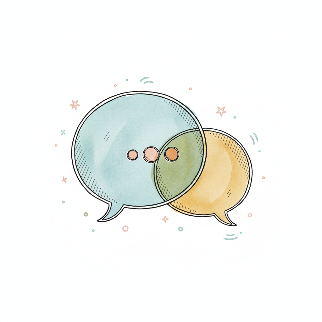 Zwei überlappende Sprechblasen in Aquarell-Optik, eine mit drei Punkten, symbolisieren Kommunikation.